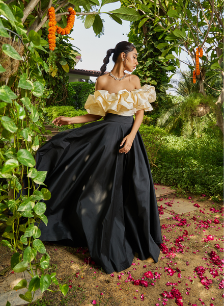 The Phoenix skirt is a "lehenga" style, full length, skirt with slit pockets. It comes in golden yellow and black and is paired with either the Wild rose top, the Flora top or the Nova top.