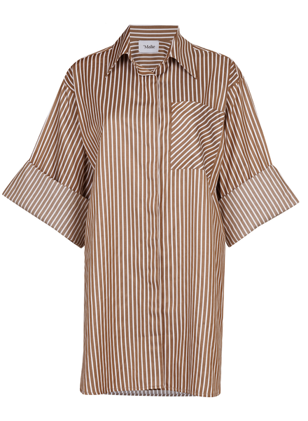 Made from crisp cotton poplin, the Bruna Dress is a modern take on a classic. This oversized silhouette features bold, all-over brown and white pinstripes and a traditional collar. The wide, three-quarter sleeves are finished with a dramatic cuff detail, adding a touch of contemporary flair. A single patch pocket on the chest and a relaxed fit complete the look, making it a comfortable and stylish option for a polished, yet casual look.