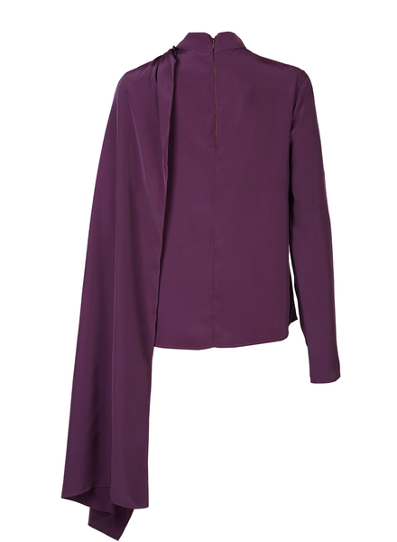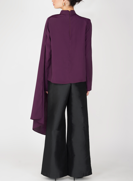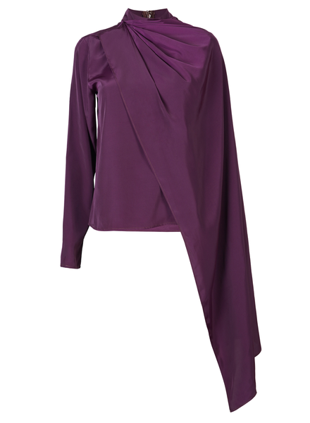 Exude confidence and sophistication in the Ines top. This striking piece features a fluid, elegant silhouette crafted from a silky-smooth crepe fabric. The high neckline flows into a dramatic, asymmetrical drape that cascades down the front, creating a unique and dynamic look. With long sleeves and a classic fit, this blouse is the perfect choice for making a bold statement, whether paired with tailored trousers or a sleek skirt.