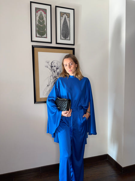 A statement in modern sophistication, the Sapphire Set embodies effortless polish and fluid movement. Cut from lustrous blue lycra satin, this coordinated ensemble features a relaxed cape-style top with softly draped sleeves that flow beautifully with every step. Paired with wide-leg trousers and a self-tie belt, the set strikes the perfect balance between comfort and refined glamour. Whether styled for a cocktail evening or a contemporary festive occasion, it exudes understated drama and timeless elegance.